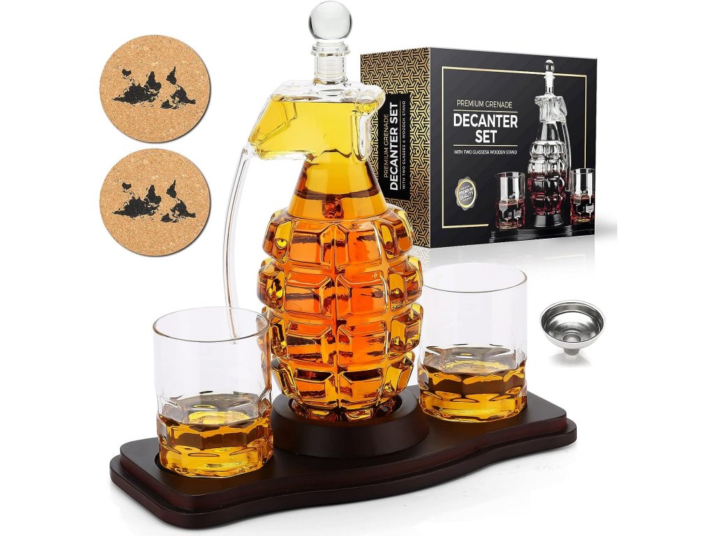 Balení obsahuje : Dárkovou krabici, karafu, dřevěný stojan, 2 sklenice 300ml, skleněná zátka, 2 tácky,