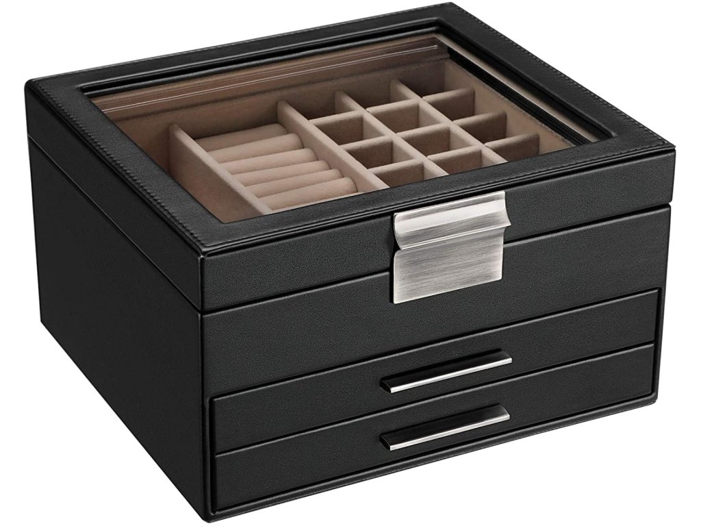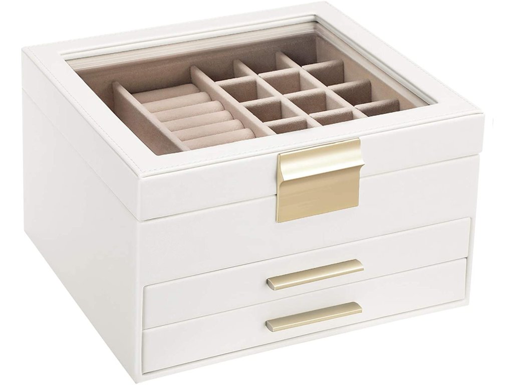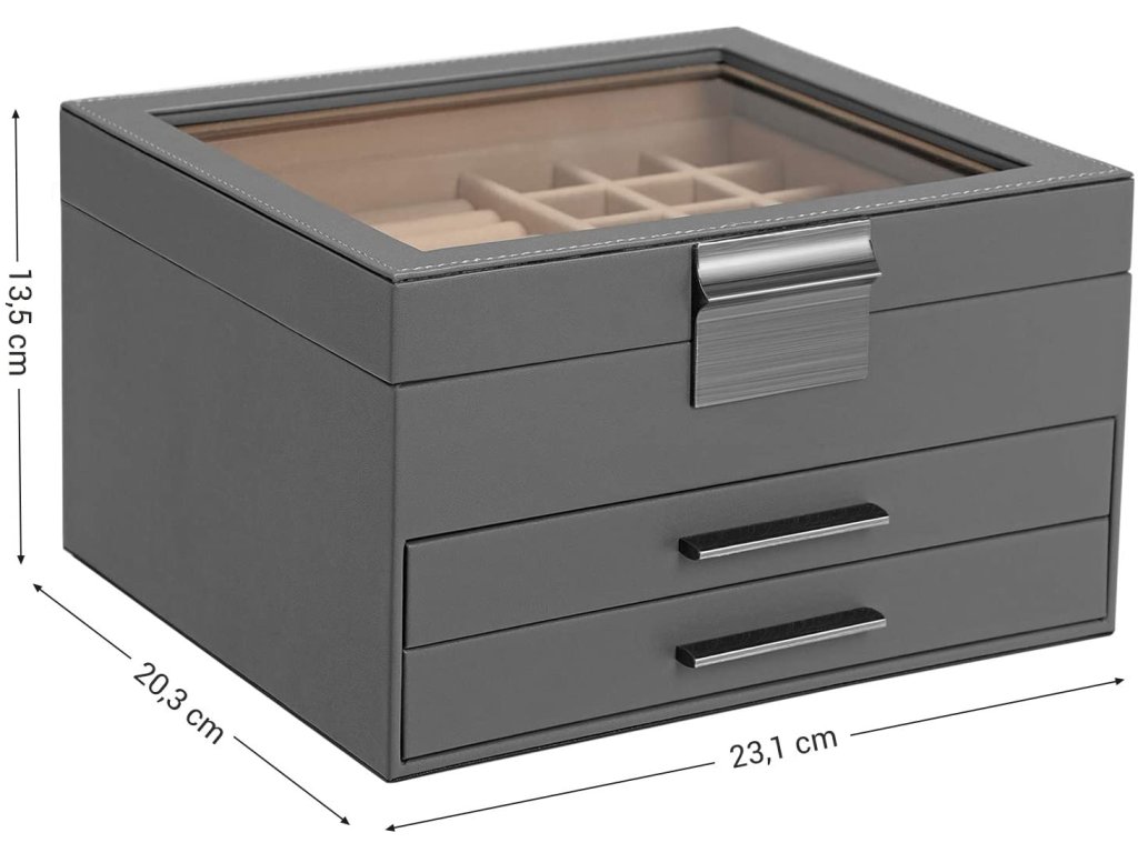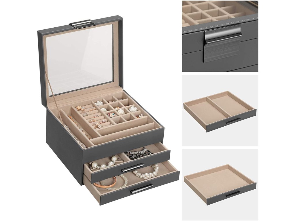 - 3 části, 7 větších přihrádek, 19 malých na drobnosti, jako jsou náušnice a prsteny.
